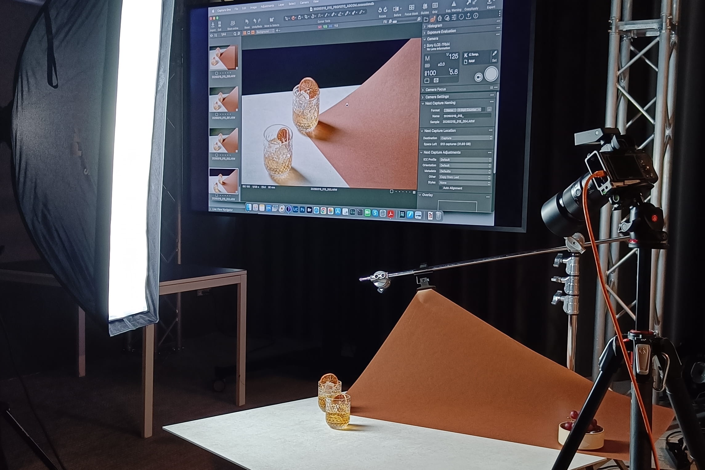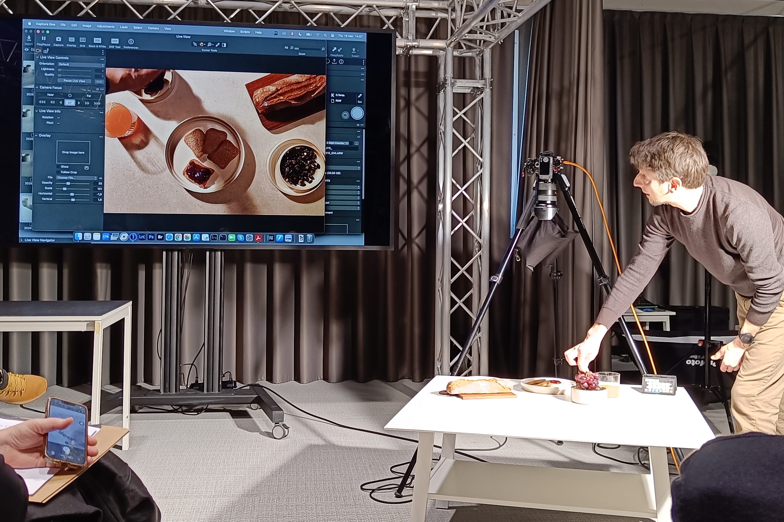 Il primo set era volutamente semplice: pane, fette biscottate, un bicchiere di succo. L'obiettivo era mostrare il workflow completo dall'inizio. Posizionamento delle luci, pannelli riflettenti per scaldare o schiarire zone specifiche, e poi il passaggio in Capture One in tethering. Il primo scatto è sempre con una card grigia per il bilanciamento del bianco, poi si lavora per successive correzioni di luce e regolazioni software fino al risultato desiderato. Quello che sembra un gesto semplice (muovere un pannello di 10 centimetri) cambia completamente l'atmosfera dello scatto.