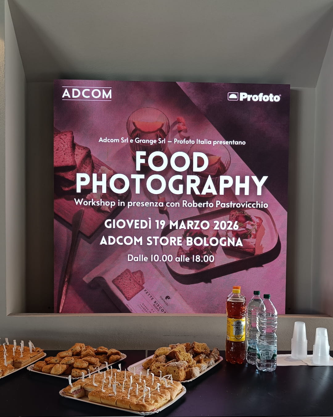 Il laboratorio si è tenuto il 19 marzo 2026 presso Adcom a Bologna, organizzato in collaborazione con Profoto Italia e Grange Srl. Docente della giornata: Roberto Pastrovicchio, fotografo professionista con oltre 20 anni di esperienza nella fotografia pubblicitaria e still life, con collaborazioni per brand come Illycaffè, Domori, Conad e Fincantieri.